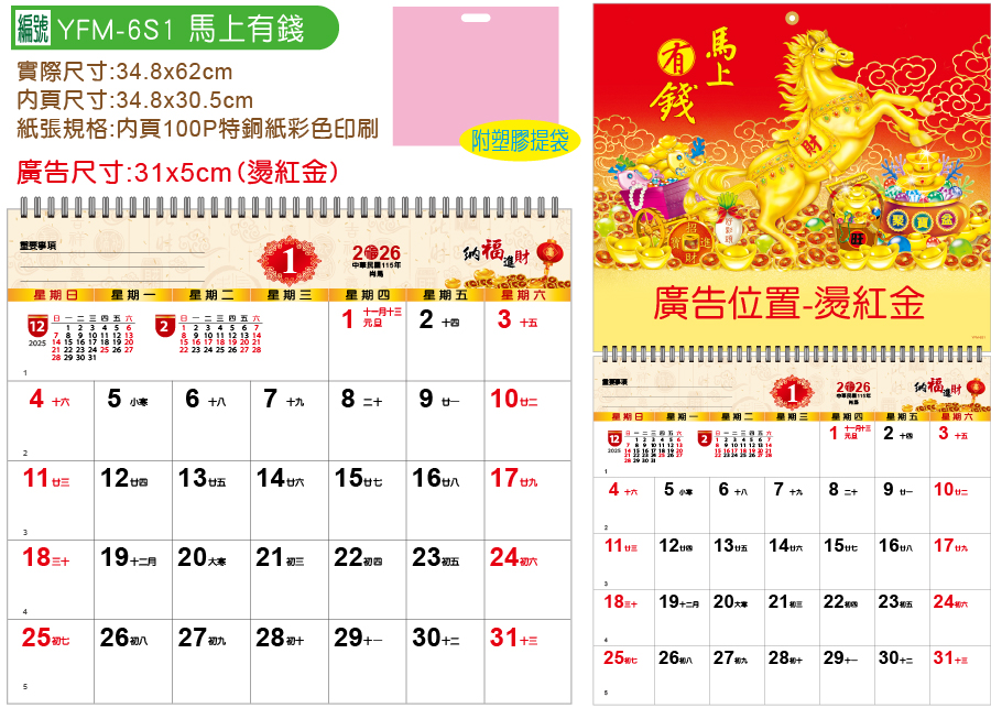 品质优良:挂版400P铜西卡/内页100P特铜纸彩色印刷制造的统义实业YFM-6S1马上有钱【统义】2026年小6K单面月历【月历工厂】【生肖月历】【2026月历】【挂式月历工厂】【出清品工厂】【超便宜工厂】【客制化制作工厂】【3000免运】,附塑胶提袋