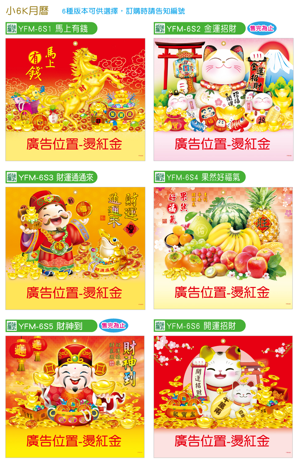 多样设计:统义实业有限公司提供YFM-6S1马上有钱【统义】2026年小6K单面月历【月历工厂】【生肖月历】【2026月历】【挂式月历工厂】【出清品工厂】【超便宜工厂】【客制化制作工厂】【3000免运】的多样化设计